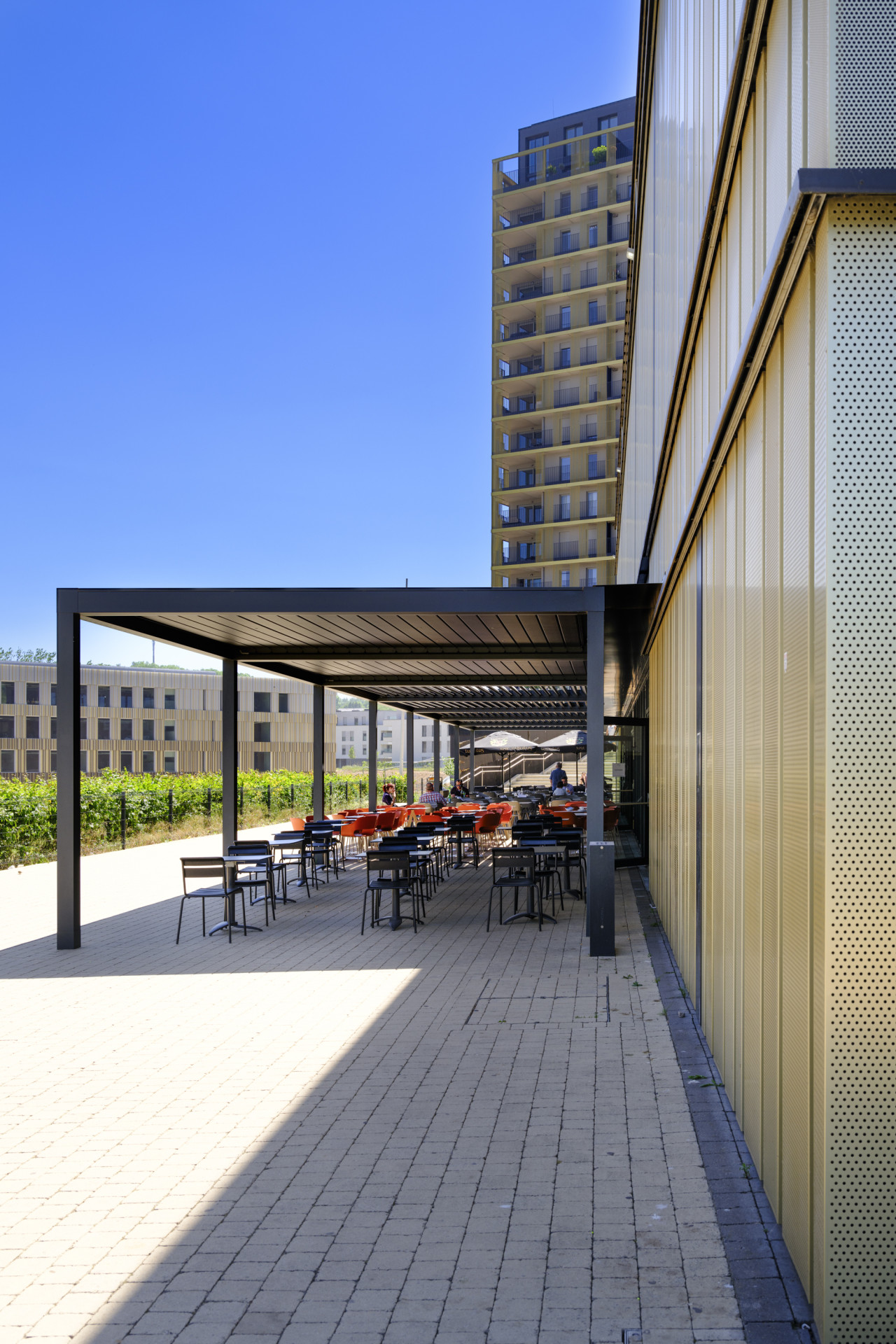L’architecture du bâtiment est elle aussi fidèle à l’héritage local. Clin d’œil de l’architecte Stefano Moreno à la sidérurgie, la façade est habillée d’un bardage qui s’intègre parfaitement dans son environnement.